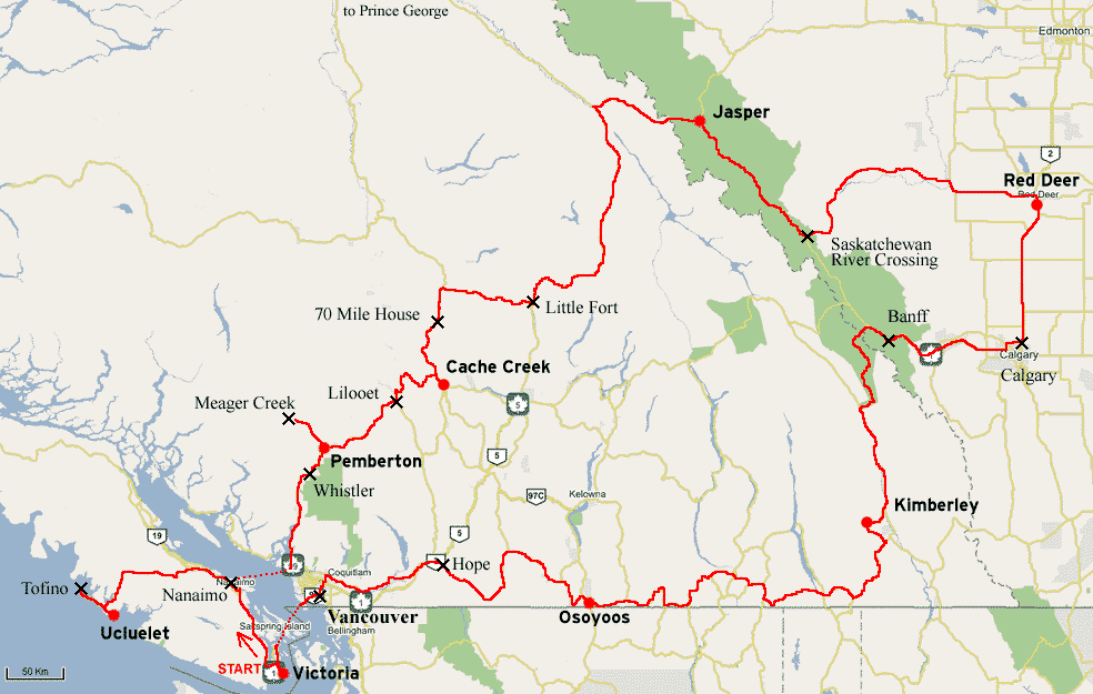 カナダ・バイク一人旅 行程図 ・ 赤いチェックポイントにマウスカーソルを移動させると情報が表示されます。 ・ 情報の内容はその日の走行距離とそれまでに走った合計の距離です。(Vicrotiaの情報は帰路データ)