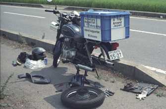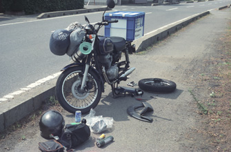 親戚の家を出て10分も経たぬうちに、バイクが「ふらふら」っときた。国道のとある大きな橋を渡っていると、「おやっ、路面が凸凹しているのか?」、「地震か?」という希望的観測が頭をよぎったが、それは紛れもなくパンクだと分かると、僕の気持ちもバイクも腰が砕けたように萎えてしまい、力なく道端に寄ったきり、遂に動けなくなってしまった。