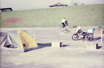 これは、バイクに乗っているときに感じた恥ずかしさとは比べ物にならないほど恥ずかしく思えた。妙な箱を積んで、古臭いバイクに乗り、それなりにキャンプの雰囲気を出している粋がった兄ちゃんが、真新しいテントを出したかと思ったら、折り目もまだしっかりしている純白の説明書を取り出し、それを必死に読みながら四苦八苦しているのである。数日後には、目を瞑ってたって支度が出来るその一人用のテントが、その時はまだその構造−ドーム型テントのシステム−がいまいち分かっておらず、10分、15分経っても一向にテントを広げることが出来ずにいた。