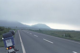 しかし、苫小牧付近で海岸に出てしばらく走ると曇ってきて、やがて濃霧になった。せっかくの景色が見えないではないか。晴れている時は草の匂いや、時折通過する牧場特有のニオイがして、大自然をかみしめられたが、バイクで走っていると霧でも体が濡れたり、ヘルメットのバイザーが濡れて視界が悪くなったりする。そうなるとバイザーを上げて走らなければならなくなり、顔は濡れるし、速度は落とさなければならないのであまり周りに気を配れなくなってくる。そうなるとバイクで走るのはちょっと憂鬱に感じるものである。