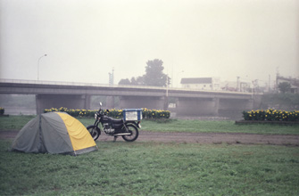 それからは北東に進路を変えてすすむわけだが、日が暮れそうになっても、日が暮れても、霧はやまなかった。とにかく距離を稼ぎたかったけれど、さすがに疲れたと同時に危ないと感じてテントを張る場所を探しながら走った。そう思ってからもしばらく走ったけれど、ちょうど広い川に差し掛かり、橋にも土手の遊歩道にも街灯があるのを見て、すぐに曲がって土手を少し走ってバイクを停めた。土手の中は広い公園や運動場になっていて、トイレも水もあるようだった。何より明かりがあるのでテントの準備も出来るし安全だろうと思った。
