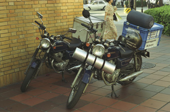 まったく同じ型で、同じように箱を積んだバイクがあったので、勝手に並べて写真を撮った。