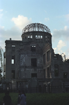 今朝、大分県は湯布院を出発し、遠回りして福岡県の山田市へ行ってみたり、本州に渡る直前にはバイク屋に寄って予備のタイヤチューブを手に入れたり、走行中、右手に見える瀬戸内海の美しい島々の景色に目を奪われたりと、ここ広島に着くまでにもいろいろあったとは言え、テントの中からずっと見ているこの建物が物語る歴史の大きさから比べたら、ほんとうに些細な事であって、つい忘れてしまうくらいであった。